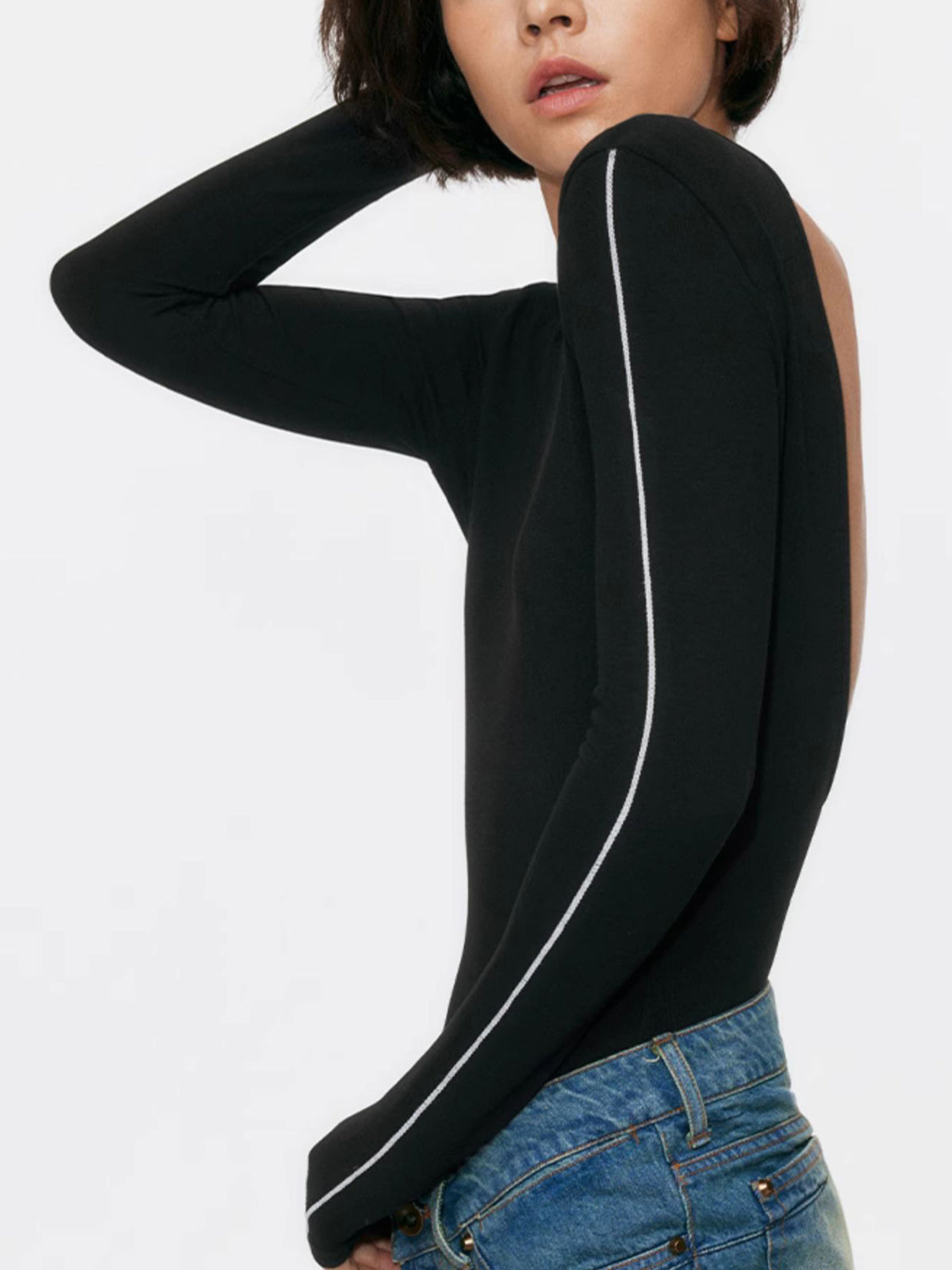 Bodysuit à manches longues à encolure ras du cou ouverte dans le dos avec bordure contrastante