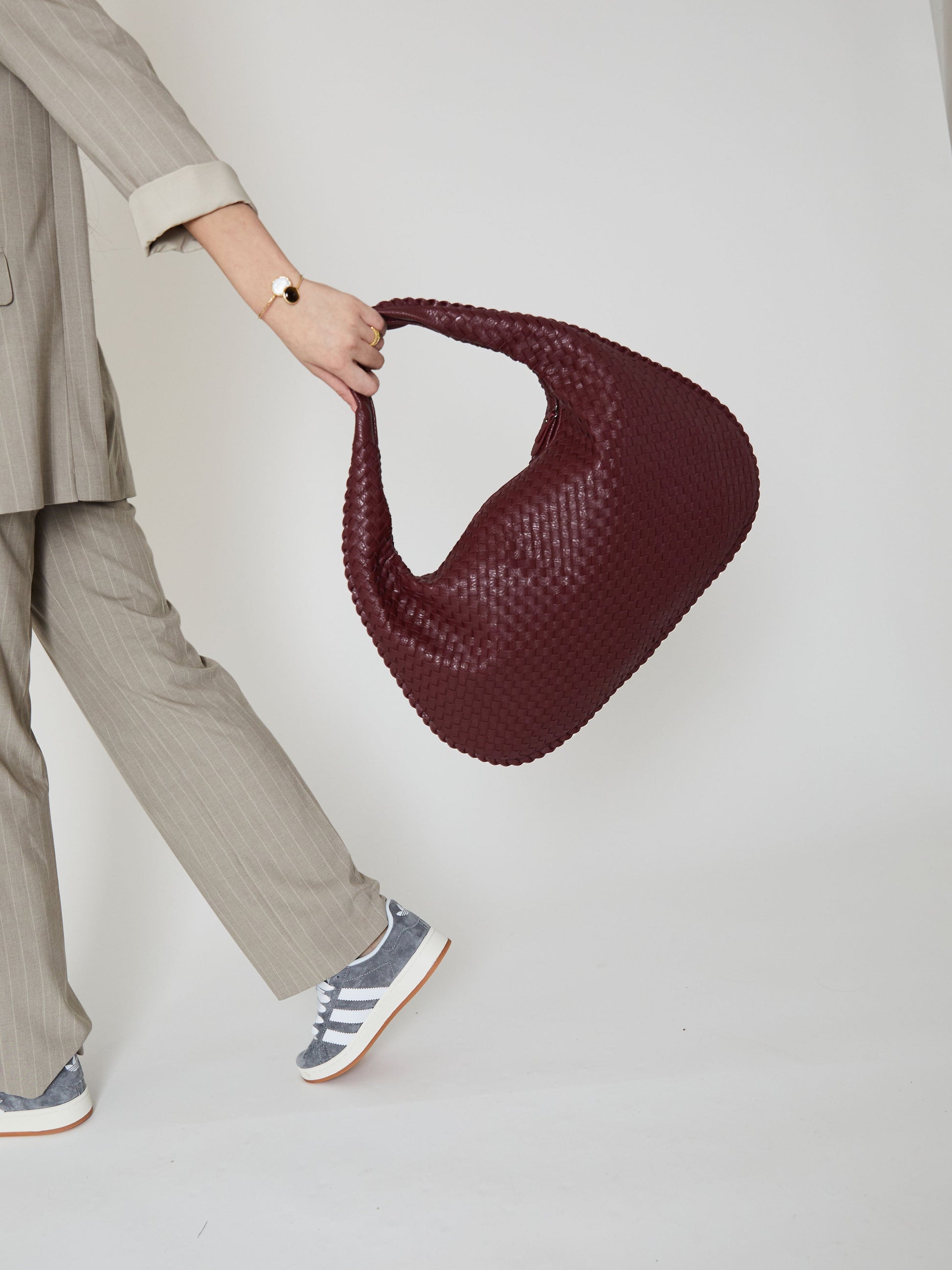 Your new GO-TO everyday bag. Our Leather shoulder bag has a round shape and a woven/braided design. The bag has a large main compartment with zip closure, and two smaller compartments with zip inside the bag and a small open pocket. The must-have bag is very roomy, and can even fit a Macbook 16" inside.