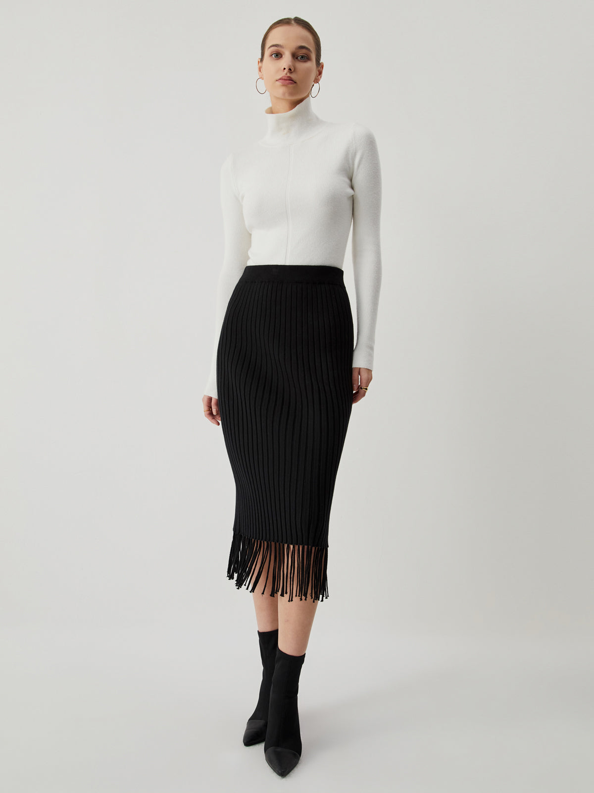 Middle Waist Ribbed Knit Tassel Midi Skirt